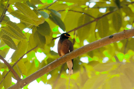 Image of common mynah bird on the branch on nature background. Wild Animals.