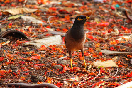 Common Myna bird (Acridotheres tristis) walking on the sidewalk.