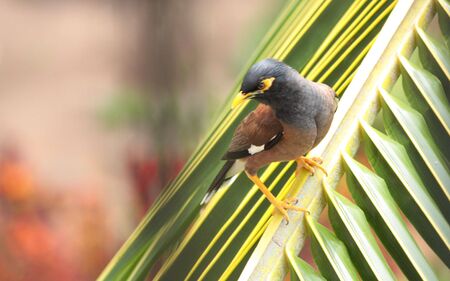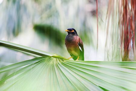 Common Myna, Acridotheres tristis melanostermus. Bird sitting on palm tree leaf.