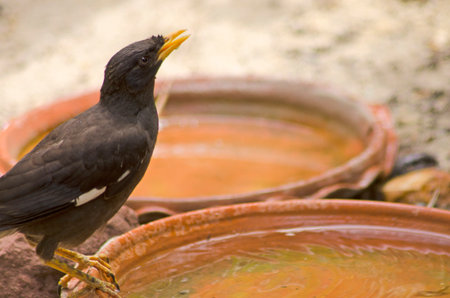 common myna. Black-colored songbird with yellow beak and yellow legs, view from above