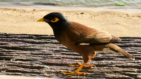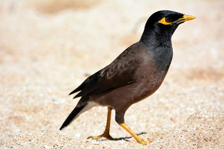 Closeup shot of Acridotheres tristis, also known as Common Myna, on sandy beach. Detailed view capturing bird's plumage and unique features in coastal environment