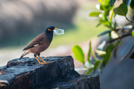 The image depicts a common myna (Acridotheres tristis) clutching a piece of plastic in its beak, a stark reminder that wildlife is in danger due to plastic pollution.