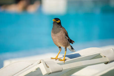 Birds swimming in the pool. Portrait of a hill mynah , Gracula religiosa bird, the most intelligent bird in the world. Close up. Thailand