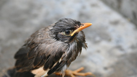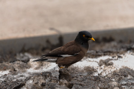 Common Myna (Sturnus tristis) bird on the wet surface on Kawai Island, Hawaii
