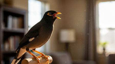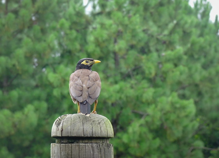 Common Myna bird (Acridotheres tristis) perching on the woodstick
