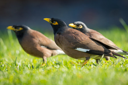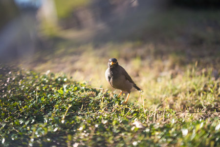 Myna bird walking around on grass in tropical nature in Patong Beach Kathu District Phuket Island Province Southern Thailand in Southeast Asia.