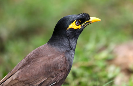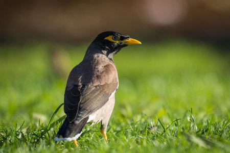 Tropical noisy bird Common myna with black and brown plumage and yellow eyes and legs is walking on the lawn with green grass.