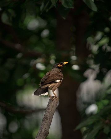 Common myna sitting on branch in garden. Bird with yellow beak on blurred dark green background. Bird in family Sturnidae. High quality vertical photo of asian bird