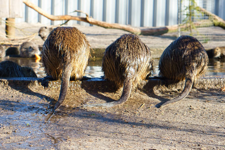Three nutria from behind. The rodents are drinking. Funny picture of mammals. Animal photo