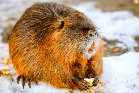 Coypu. nutria eats carrots close-up.