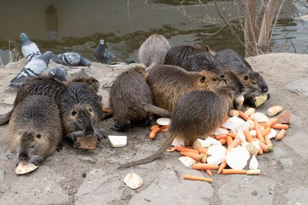 A nutria on the river bank eats vegetables