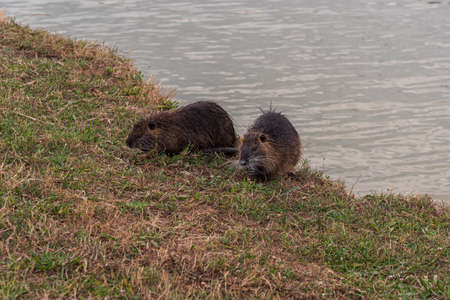 Two nutrias (Myocastor coypus) walking near water and looking for food (Grado, Italy)