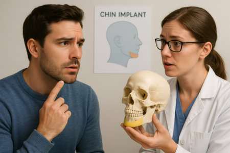 Doctor holding skull model explaining chin implant surgery to patient pointing his chin at the doctor's office
