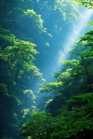 Sunlight through trees in leafy forest Picture