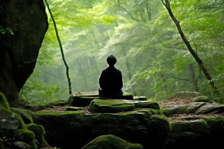 Serene Moment Man in Traditional Attire Finds Peace in Lush Green Nature, Tranquility and Retreat