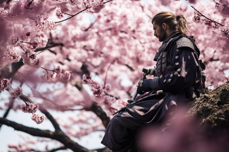 Samurai stands near cherry blossom tree. AI generated