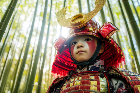 Child cosplaying a samurai warrior standing in a bamboo forest, showcasing Japanese culture and history