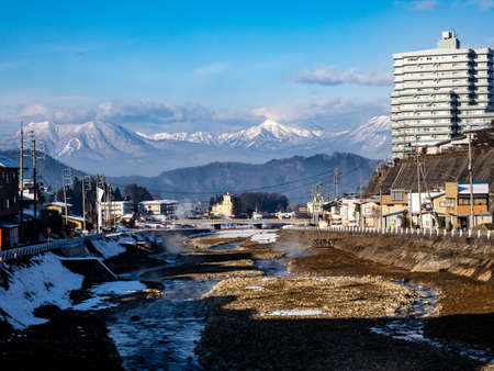 Cityscape of Yudanaka in Japan with snowy mountains in the background. Famous for its snow monkeys bathing in hot springs