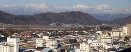 Beautiful Iwate mountain in Spring season, cityscape against blue sky in Morioka city, Iwate prefecture, Japan. famous Landmark Travel and Vacation destination