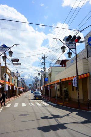 Fujikawaguchiko / Japan - May 02 2019: Fujikawaguchiko-machi, Honcho street. The road to Mount Fuji. Fujiyama in the background