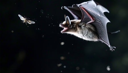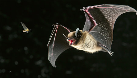 A bat is captured in mid-flight, soaring through the darkness with its wings elegantly extended.