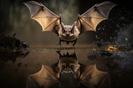 A close up image of bat in the wild flying above the water river and reflection