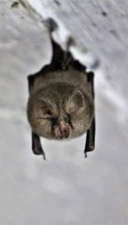 A wild bat hangs in a dream on the ceiling of a stone cave. Little bats in the North Caucasus