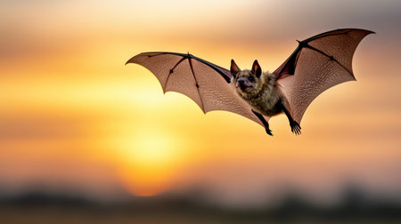 Bat with outstretched wings flying from a dark cave entrance. bright sunrise illuminates the horizon, creating a dramatic silhouette against the sky.