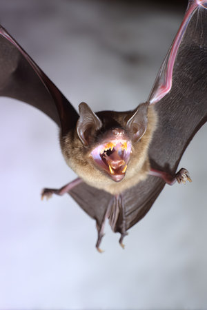 Flying pipistrelle bat (Pipistrellus pipistrellus) spectacular maneuver action shot on wooden attic of house with bright background