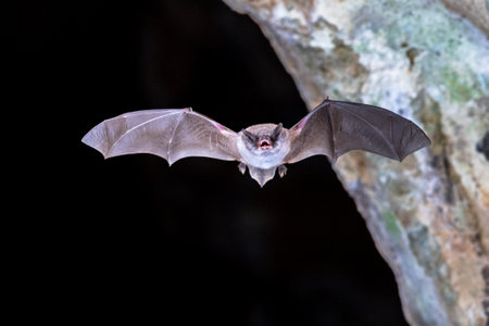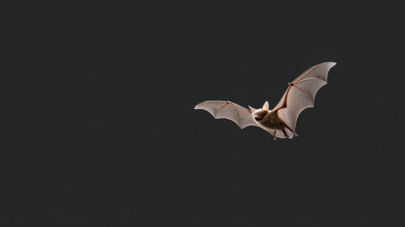 A stunning image of a bat flying gracefully against a dark background, highlighting its intricate wing structure and showcasing the beauty of nocturnal wildlife.