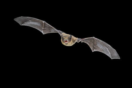Flying Pipistrelle bat (Pipistrellus pipistrellus) action shot of hunting animal isolated on black background. This species is know for roosting and living in urban areas in Europe and Asia.