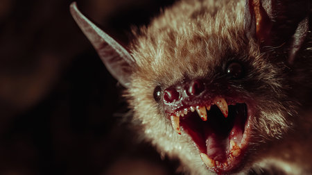 A captivating close-up of a vampire bat showcasing its sharp teeth and fierce expression. This nocturnal creature epitomizes the unsettling beauty of nature.