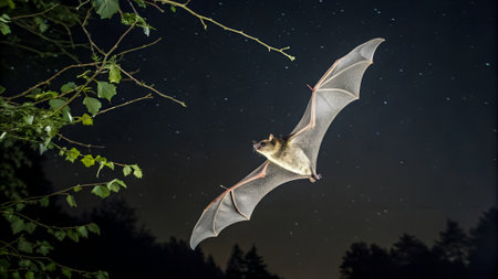 Bat soars gracefully at night, navigating through a dark sky filled with stars. Surrounding branches create a natural frame, highlighting its wing structure.