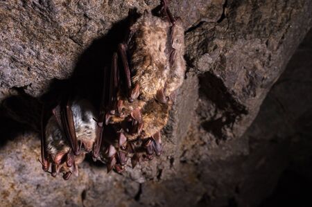A group of brown bats sleeps on the ceiling of a rock cave. Wild little bats of the North Caucasus