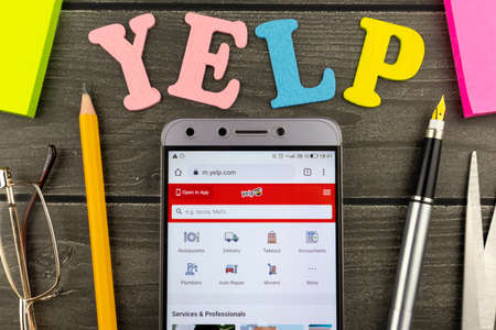 Moscow, Russia - 01 April 2021: Business concept using the list making application Yelp with office supplies and reading glass framing a mobile phone showing the landing page of the website