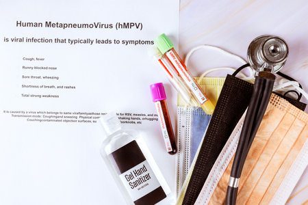 Overview of Human Metapneumovirus hMPV symptoms, prevention tips, blood test tubes displayed with medical sanitizer.