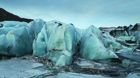 Aerial view of glacier from above, ice and ashes of the volcano texture landscape, beautiful nature ice background from Iceland
