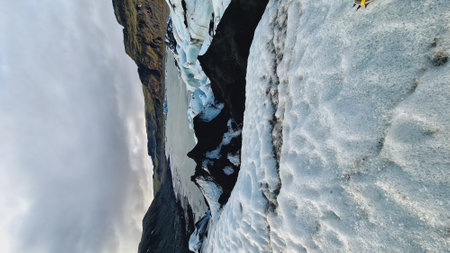 Fantastic view on Solheimajokull glacier in Katla Geopark on Icelandic Atlantic South Coast. Location: South glacial tongue of Myrdalsjokull ice cap, near Vik village, Iceland, Europe