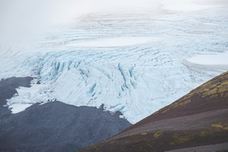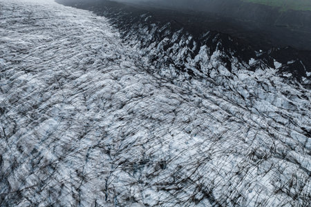 Aerial glacier with ash streaks against volcanic slope in Iceland