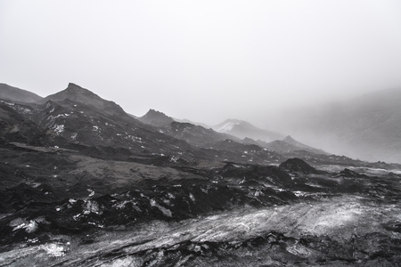 Sólheimajökull Glacier in Iceland showing ash piles on the ice and heavy fog.