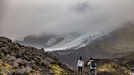 Tourist on glacier landscape photo. Iceland nature. Beautiful nature scenery photography with grey sky on background. Idyllic scene. High quality picture for wallpaper, travel blog, magazine, article