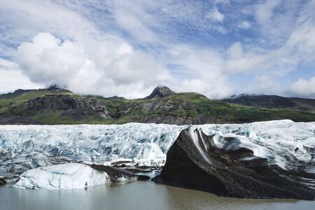 Skaftafell glacier landscape in Svinafell, Iceland. Background of green mountains, ice and snow. Melting glaciers, global warming.