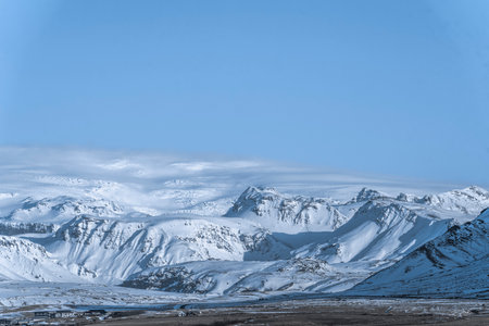 Icelandic winter landscape with snow mountains covered and blue sky.