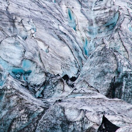 Icelandic glacier close up with ash streaked ridges and crevasses