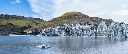 Sólheimajökull glacier, Iceland. The tongue of this glacier slides from the volcano Katla. Beautiful glacial lake lagoon with blocks of ice and surrounding mountains. People unrecognizable.