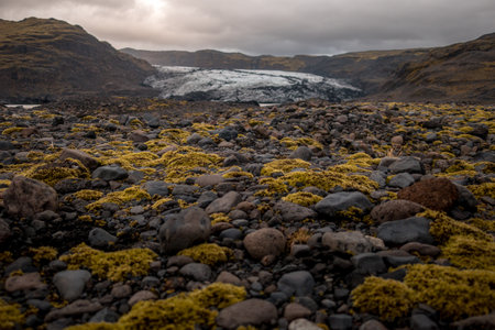 A ground covered with stones and moss at Solheimajokull glacier, in Iceland