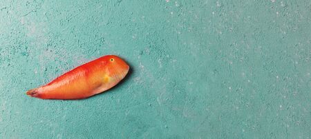 Beautiful tropical red sea fish Pearly razorfish on a turquoise or tiffany color background. Galan fish Xyrichtys novacula, seafood from Mediterranean Sea. Banner with copy space, top view