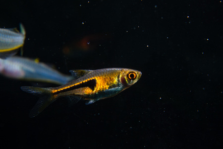 Colorful tetra fish in hobby auqarium with green water plants