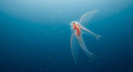This captivating fish glides effortlessly in deep water, displaying its striking black and white pattern along with delicate fins, while exploring its aquatic habitat.