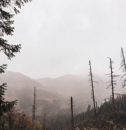 Dark December day in the mountains, Tatra National Park, Poland. Clouds and mist around the ridges. Selective focus on the forest growing on a slope, blurred background.
